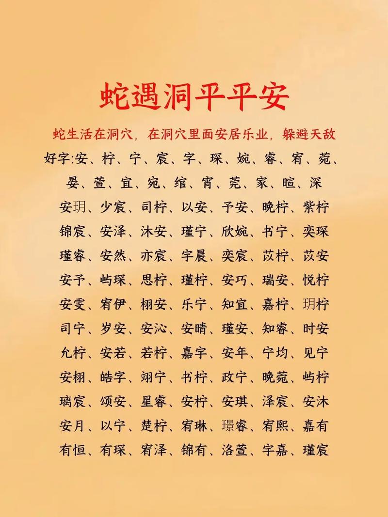 蛇是穴居动物,喜欢钻洞、名字中若带有“口”或“宀”(宝盖头),象征着孩子未来有房产之福,家庭生活稳定,不至于四处漂泊、例如“茹”、“容”、“宁”、“宜”这些字,在感官上给人一种安定、被保护的感觉、对于女性来说,这不仅代表物质生活的保障,也象征着情感世界的归宿感。