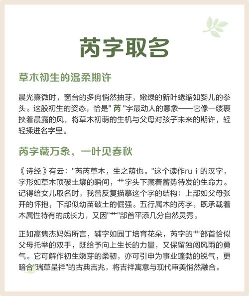 考虑名字的时候,不妨在大自然中寻找灵感、看看风吹过草地的样子,看看云影在大地上移动的节奏、这些自然的韵律,其实都藏在我们这些汉字的横竖撇捺之中、芮,就是那片承载希望的土地,就是那个孕育未来的起点。