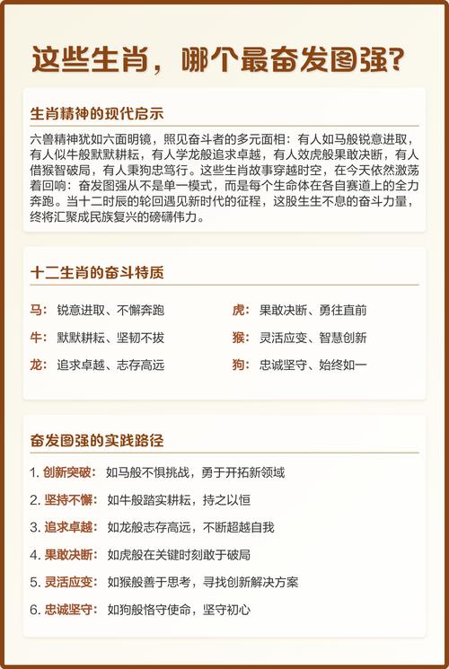 论及“奋发图强”这股精神气,若将其与十二生肖的命理气场相对应,并非能简单地指向某一个属相、每个生肖都有其独特的能量场与行事风格,其“奋发”之态与“图强”之路,各有千秋、然若论及气势最盛、目标最宏大、行动力最强的几个,则非龙、虎、马莫属。