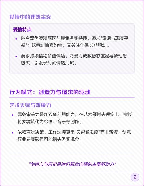她就像一株生长在幽静山谷里的兰花,不与百花争艳,却自有其清雅的芬芳、要真正了解一位属兔双鱼座的女子,需要放下急躁的评判,用同样温柔与细腻的心去靠近、你会发现,在她那看似柔弱的外表之下,隐藏着一个无比丰饶、坚韧且充满灵性的宇宙。