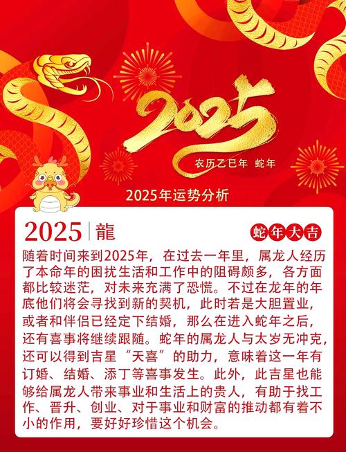 对于已有伴侣或已婚的属龙人,双方关系整体和谐,能够相互扶持,共同进步、印绶相生,也意味着家庭的稳固与责任感的增强、伴侣会成为你事业上最坚实的后盾,给予你精神上的鼓励、火旺也可能带来情绪上的起伏、因工作繁忙,你可能会忽略对伴侣的陪伴与关心,或因小事而发脾气、务必学会平衡工作与生活,多抽时间与爱人沟通交流,共同参与一些娱乐活动,为感情增温、避免因外界的桃花诱惑而动摇心志,珍惜眼前人,方能情缘长久。