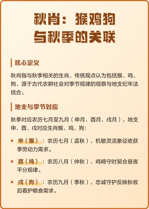 秋季在十二地支中对应的是“申、酉、戌”三个地支、若要精准定位秋季对应的生肖,则分别是猴(申)、鸡(酉)、狗(戌)、这三个生肖共同构成了五行中的“金”局,象征着万物由繁茂转向成熟、由向上生长转为向内收敛的自然过程。