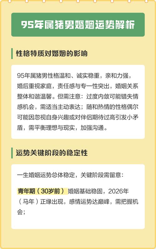 2026年对于95年属猪人来说,是一个“情投意合但考验重重”的年份、丙火为乙木的伤官,伤官主感性与浪漫、单身人士今年遇到的异性大多性格开朗、甚至有些张扬、这种性格初期非常吸引你,但长期相处中,你内心的亥水本质是内敛的,这种水火冲击会让彼此产生疲劳感。
