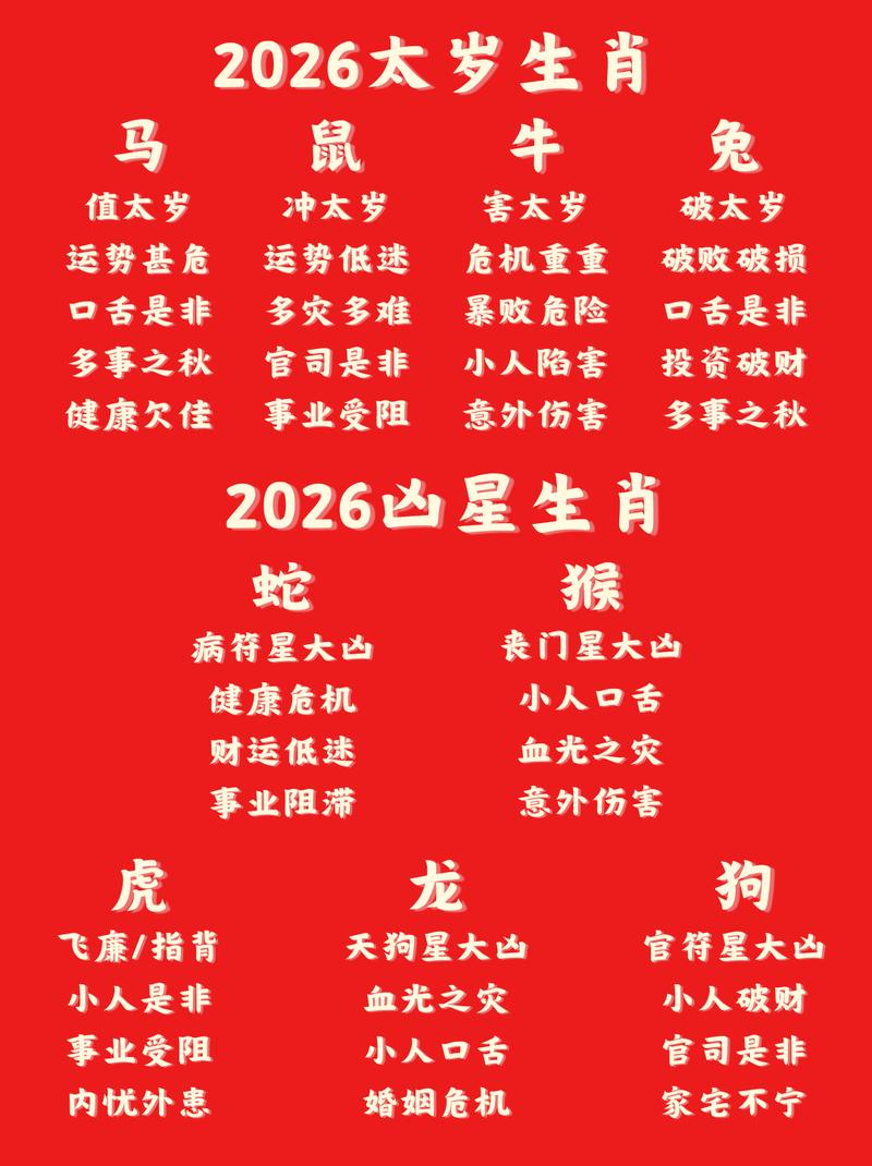 太岁,古称木星,乃岁中之君,掌管一年之祸福、犯太岁者,实则是自身生肖地支与流年太岁地支产生了冲、刑、害、破、值等不和谐的关系、这种地支间的磁场冲突,会导致人在情绪、事业、财运或健康方面出现剧烈波动、2026年受太岁影响最为显著的四大生肖分别为:属马者(值太岁、自刑)、属鼠者(冲太岁)、属牛者(害太岁)、属兔者(破太岁)。