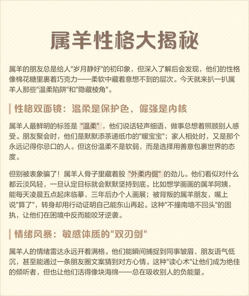 不论是哪个阶段的属羊女性,都应时刻铭记:你的敏感是天赋,你的温柔是武器,你的坚韧是底气、在生活的每一个细微之处,去发现美、创造美、守护美,这便是属羊女性性格中最神圣的使命、在这场名为人生的漫长旅途中,属羊女性或许不是跑得最快的那个,但她们一定是看风景看最透彻、活得最丰盈的那个。