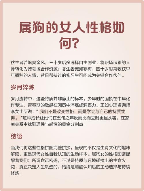 从命理深度解析,属狗女人性格中的“库”性非常重要、戌为火库,火代表文明、思想、名誉、这意味着优秀的属狗女人精神世界非常丰富、她们不断地学习,不断地向内求索,将外界的知识和经验吸收进自己的“库”中,转化为智慧、这种性格让她们在晚年往往能拥有极高的威望。