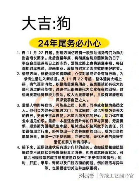 属狗人在虎年,是一个从“守望者”向“开拓者”转变的过程、在这个过程中,所有的汗水都会化为成长的台阶,所有的困惑都会化为智慧的结晶、只要能够把握住寅戌半合的大势,顺应五行流转的自然规律,那么这一年必将成为属狗人生命里程碑中浓墨重彩的一笔、在这个大时代背景下,属狗人的稳重与忠诚,结合虎年的冲劲与灵感,必能谱写出一曲事业与生活的华彩乐章。