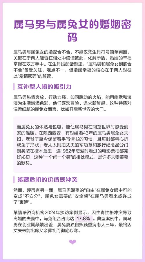 这种结合,不仅是两个个体的结合,更是两种生命姿态的对话、让马的奔腾带动兔的飞跃,让兔的细腻点缀马的辉煌、这才是真正的生肖配对之魂,也是每一个属马女与属兔男应该追求的最高境界。
