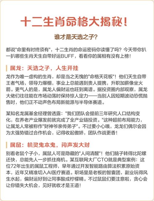 须知,生肖仅为八字命盘中的一字,虽能揭示流年气运之一隅,却非全貌、真正的“天选之子”,其命盘格局必然与流年大运高度契合,且个人心性、德行与能力,亦能承载这份天降之运、运来之时,懂得把握,奋力而上;运势平平时,则需潜心修行,积蓄力量、所谓天选,不过是天道酬勤,地道酬善,人道酬诚,三者合一的结果罢了。