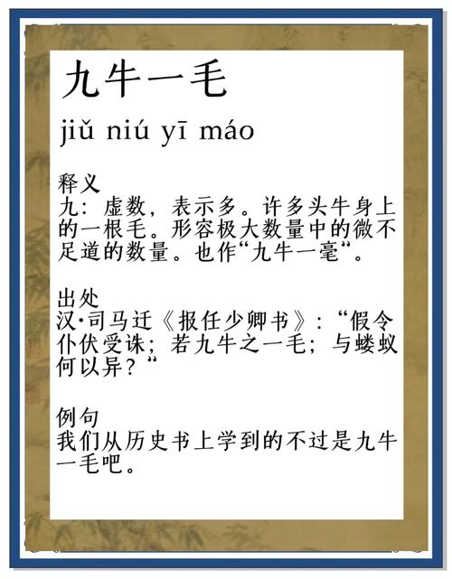 从最直观的层面剖析,“九牛一毛”中硕大的“牛”字,直接将线索指向了十二生肖中的丑牛、牛,作为农耕文明的基石,象征着勤劳、坚韧与巨大的力量、成语中的“九牛”,并非实指九头牛,而是运用了数字“九”的极致含义,代表着数量众多、力量无穷、九牛之力,是何等宏大磅礴。
