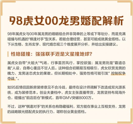 在中华传统的生肖文化中,虎与龙,皆为力量与权威的象征、当属虎的男性与属龙的女性走入婚姻的殿堂,这并非寻常的结合,更像是一场势均力敌的相逢、他们的婚姻画卷,底色浓烈,既有可能是波澜壮阔的史诗,也可能演变为硝烟弥漫的战场、其状况如何,全看二者如何执笔。