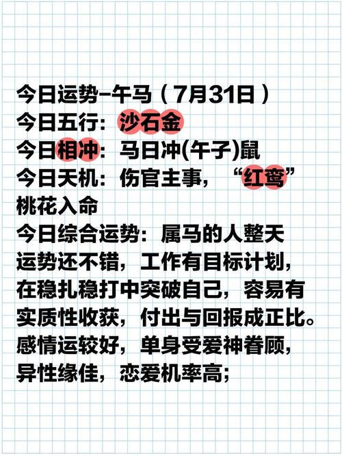 时入丙午流年,属马之人正值本命之年,古语有云:“太岁当头坐,无喜必有祸”、此言并非危谈,实则点明此年运势基调多变,暗流涌动、今日运势,亦受此大环境影响,万事皆需步步为营,谋定而后动。