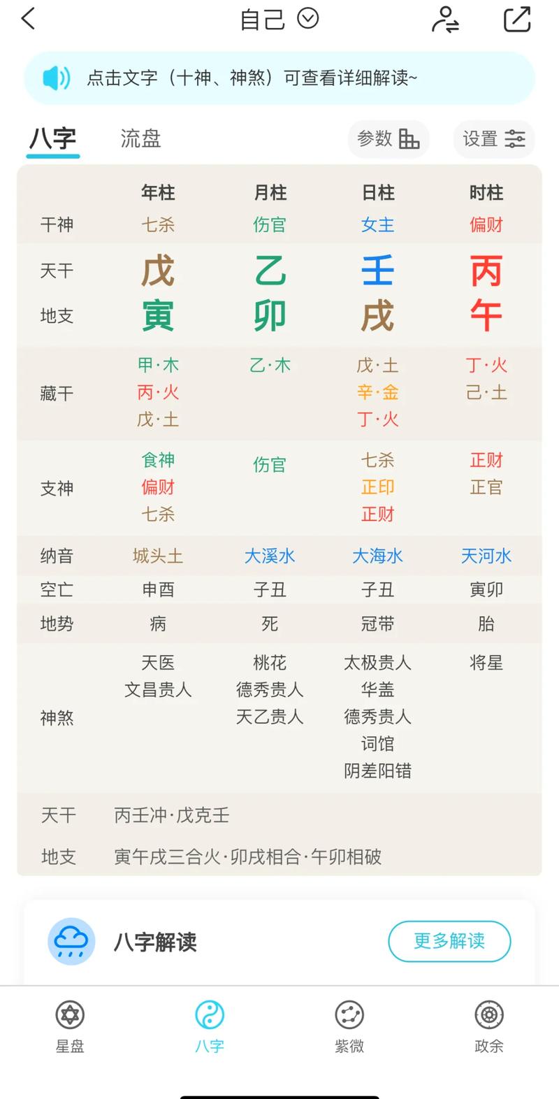 想要让手机排盘更上一层楼,还得关注“空亡”、在很多排盘APP里,空亡是用括号标注出来的、别小看这两个字,它能让原本强旺的五行瞬间失去力量、如果一个人的财星正好落在了空亡上,哪怕八字里财再多,也往往是财来财去一场空、很多简易软件不标空亡,这就会导致巨大的误判。