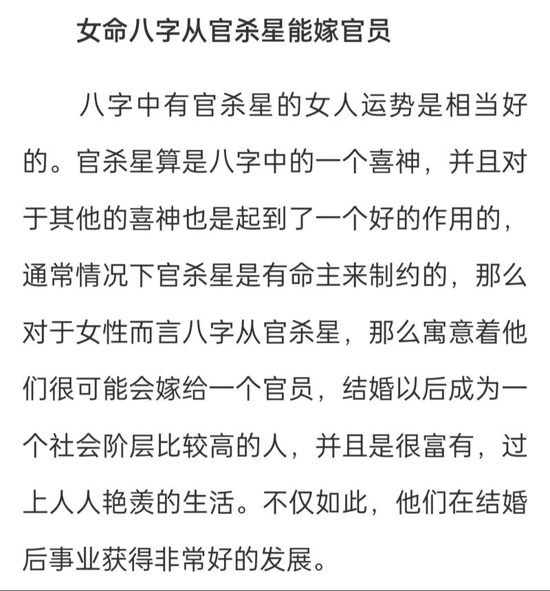 高官之命,其背后必然有财力的支撑或资源的运筹、在女命中,财星是生助官星的源泉、如果一个女性的八字中财星旺相,且能去生助官星,这种格局被称为“财官双美”、此类命局的女性,不仅能嫁给有实权的丈夫,往往自己也是理财高手或社交名媛,能为丈夫的升迁提供实质性的帮助。