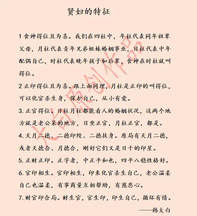 贤惠的女命八字,本质上是五行能量的一种“良性循环”、它是克制力(官)、包容力(印)、创造力(食伤)、执行力(财)以及自我修养(比劫受制)的完美结合、当这些能量在八字中各得其位,不互相拆台,不无谓损耗,表现出来的行为模式就是我们传统意义上称赞的“贤惠”。