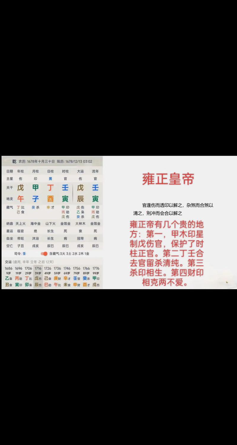 在这个八字中,我们还能看到一种深层的宿命感、子水月令是杀星,杀星代表压力、挑战、名声、雍正一生背负“篡位”、“弑父”、“屠弟”等种种骂名,这些骂名就是子水对丁火的克制、而他用一生的勤政去回应这些质疑,用甲木印星去转化这些杀气、名声对他而言,既是沉重的负担,也是前进的动力。