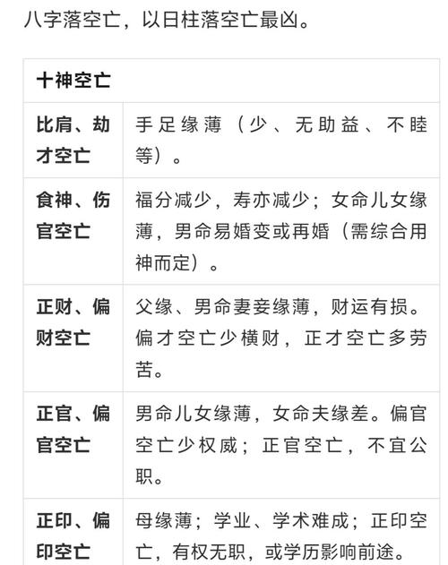 日柱代表自己和配偶、日坐空亡,夫妻感情容易貌合神离,或者另一半身体较弱、事业起伏大、这是一种“内环境”的不稳定、在化解上,通常建议晚婚,或者寻找八字中能互补掉这个空亡字眼的伴侣,这叫“以气补气”。