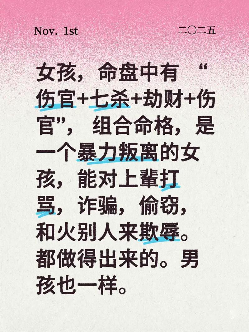 伤官、劫财、七杀的组合,本质上是生命力的一种过载表现、它就像核能,用好了能为整座城市供电,用不好就是一场灾难、这种命的人,天生就是来体验极限人生的、他们不需要同情,也不需要指点,他们需要的是在一次次跌倒后,依然能凭借那股狠劲重新站起来的舞台。