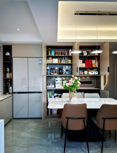 冰箱与水槽的距离也需考量、如果餐厅内设有简易水槽,冰箱不宜紧邻水槽、水槽代表“流财”,冰箱代表“存财”、紧邻水槽会让存下来的钱流失得飞快、两者之间最好用橱柜或绿植阻隔,形成一个明确的功能分区。