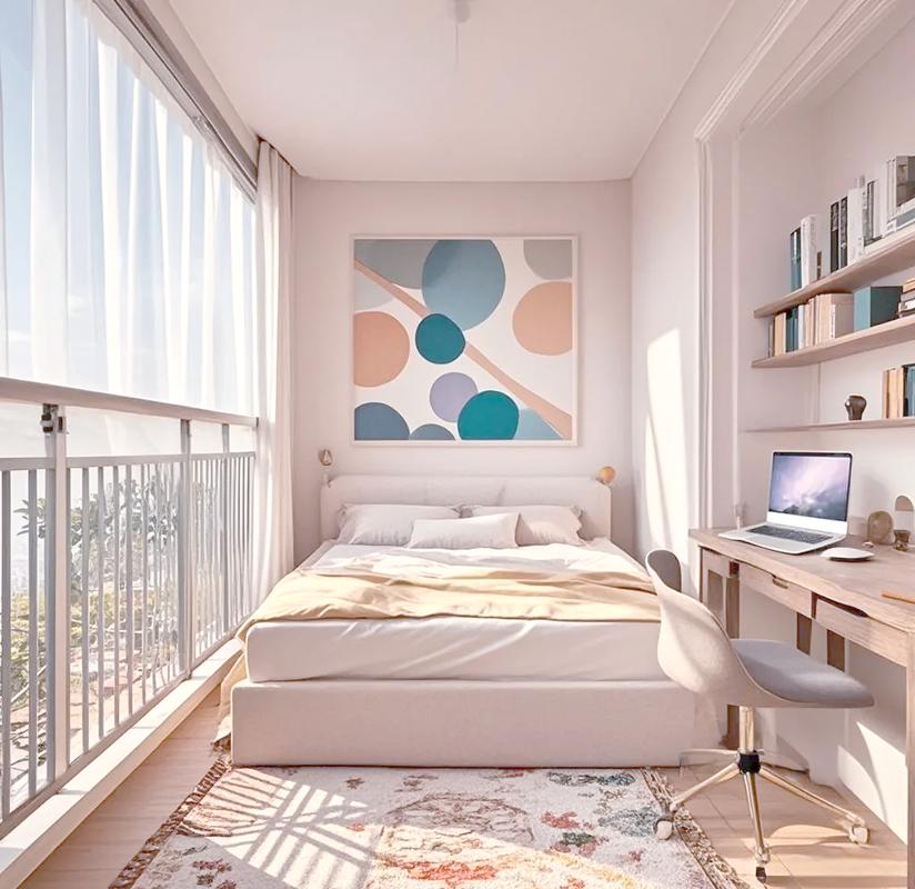 露台改建后的进深往往有限,床铺的摆放成为难题、床尾不可直对着房门,此为“掉魂煞”;床侧也不宜紧贴着大面积的玻璃幕墙、最佳方案是在玻璃墙与床之间设置一个实木矮柜或屏风作为缓冲。