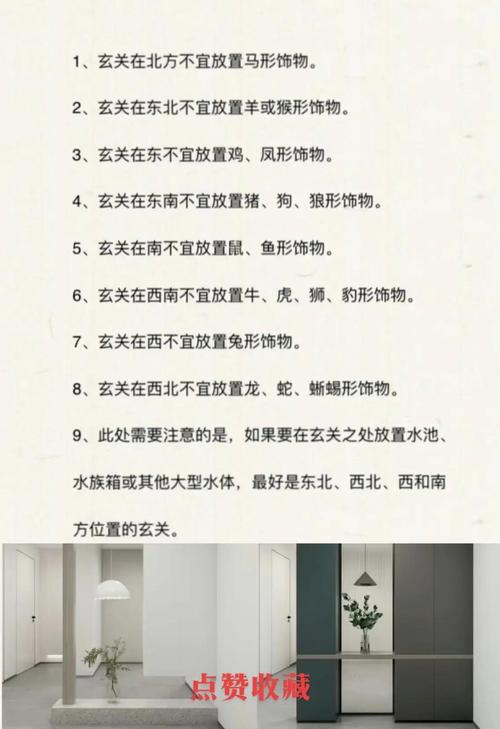 摆件方面,麒麟、貔貅是镇宅化煞的常用利器、若玄关正对室外的电梯口、尖角、电线杆等外部煞气,需摆放一对头向外的石狮子或铜麒麟、若仅为聚财,则可摆放三脚金蟾,头向内摆放,寓意吐财入家、需要注意,摆件必须保持整洁,不可蒙尘,否则灵性受阻。