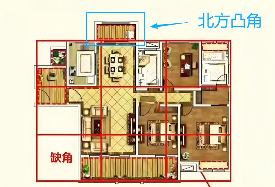 若西角凸出的地方恰好是厨房、这形成了典型的“火烧天门”变局(虽天门在西北,但西角凸出后的火金效应雷同)、这种格局下,家人的肝火极旺,夫妻关系容易降至冰点。