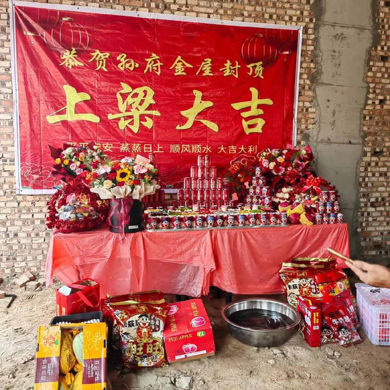 吉时一到,工匠师傅们便开始升梁、宅主或德高望重之长者需口念吉利话,如“上梁大吉,紫气东来;金玉满堂,富贵花开”、当主梁缓缓升起,即将安放妥当之时,便会进行“撒梁”仪式、宅主家人从屋顶向下抛洒用红包装好的钱币、糖果、花生、糕点等,此举称为“抛梁”,寓意着将福气与财富散播给邻里乡亲,共享喜悦,也为新宅讨个好彩头。