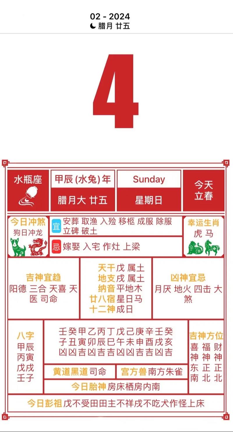 特别需要注意的是,本日恰逢“立春”节气、立春乃二十四节气之首,象征着冬之终结,春之开端,万物复苏,阳气始生、在命理学和择日学中,立春是一年气场的转换点,意义非凡、故此日的能量交替,气场活跃而又复杂,行事需顺应天时,以平稳过渡为上。