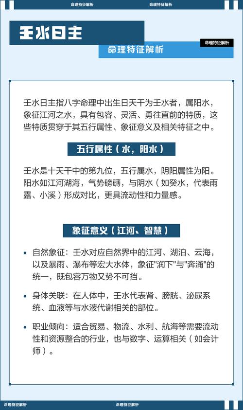 壬水命人的核心特征在于“动”与“纳”、大海之水不流于死寂,必有波涛、壬水日主通常具备极强的适应能力,能够在复杂的社会环境中迅速寻找自己的定位、他们不喜欢受约束,更倾向于在广阔的天地中施展抱负、壬水思维敏锐,处事果断,有时甚至显得有些激进、因为壬水主智,这类人往往多才多艺,见识广博、由于水性向下、向远,壬水人骨子里有一种追求自由的渴望,一旦被束缚在狭小的空间或呆板的流程中,其才华便会枯竭。
