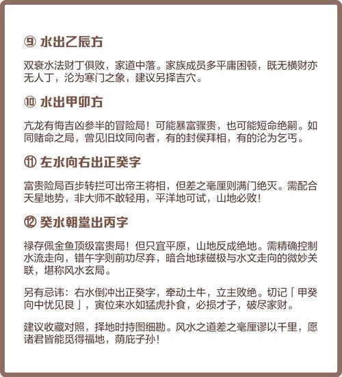 “冲破旺位”则称为“旺方怕煞”、水从帝旺位流出,如火局水出丙午,金局水出庚酉、旺位是能量最强的点,水流此处必须是“来水”而非“去水”、若水从此流走,意味着家财散尽,即便富贵也是昙花一现、这种水口多主官非讼事,且容易出现性情暴戾之徒。