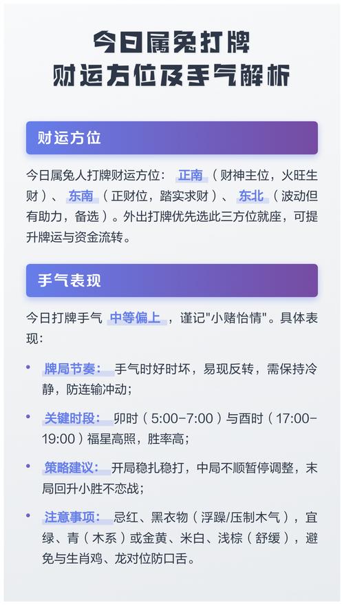 关于打牌的时间,属兔人应尽量避开深夜、晚上11点到凌晨1点是子时,子午相冲,而子又是你的生旺之地、在这个时间点,流年火气与时辰水气剧烈冲突,对于属兔的人来说,这会让你陷入极度的疲劳和判断失误、最适合你的时间是下午的1点到3点(未时),这个时候火气渐退,土气生发,是你最容易进财的时候。