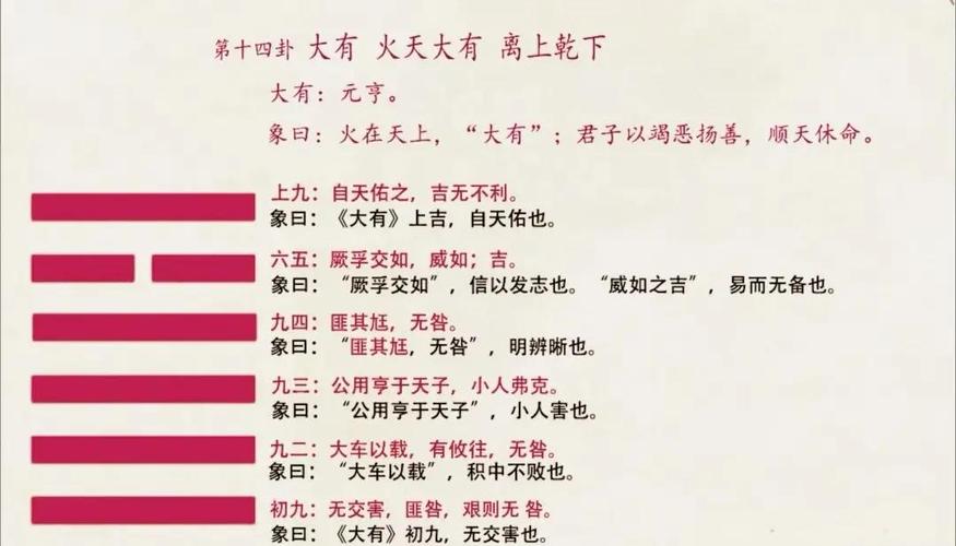 六五:厥孚交如,威如,吉、 这是大有卦的灵魂所在、身为唯一的阴爻,却能统领五个阳爻,靠的是诚信(孚)、在2026年,不管是做生意还是做管理,诚信就是你的核武器、既要有亲和力,又不失威严,这是大吉大利的表现。