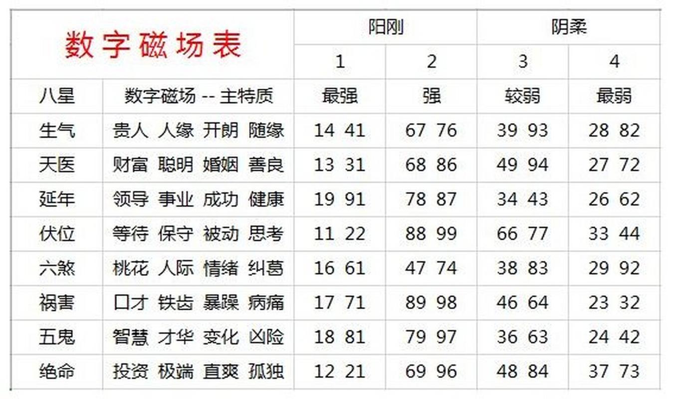 数字能量学将两位数字的组合分为四吉星(天医、延年、生气、伏位)与四凶星(绝命、五鬼、六煞、祸害)、在丙午马年,这些磁场的感应力度会因岁星影响而发生偏移。