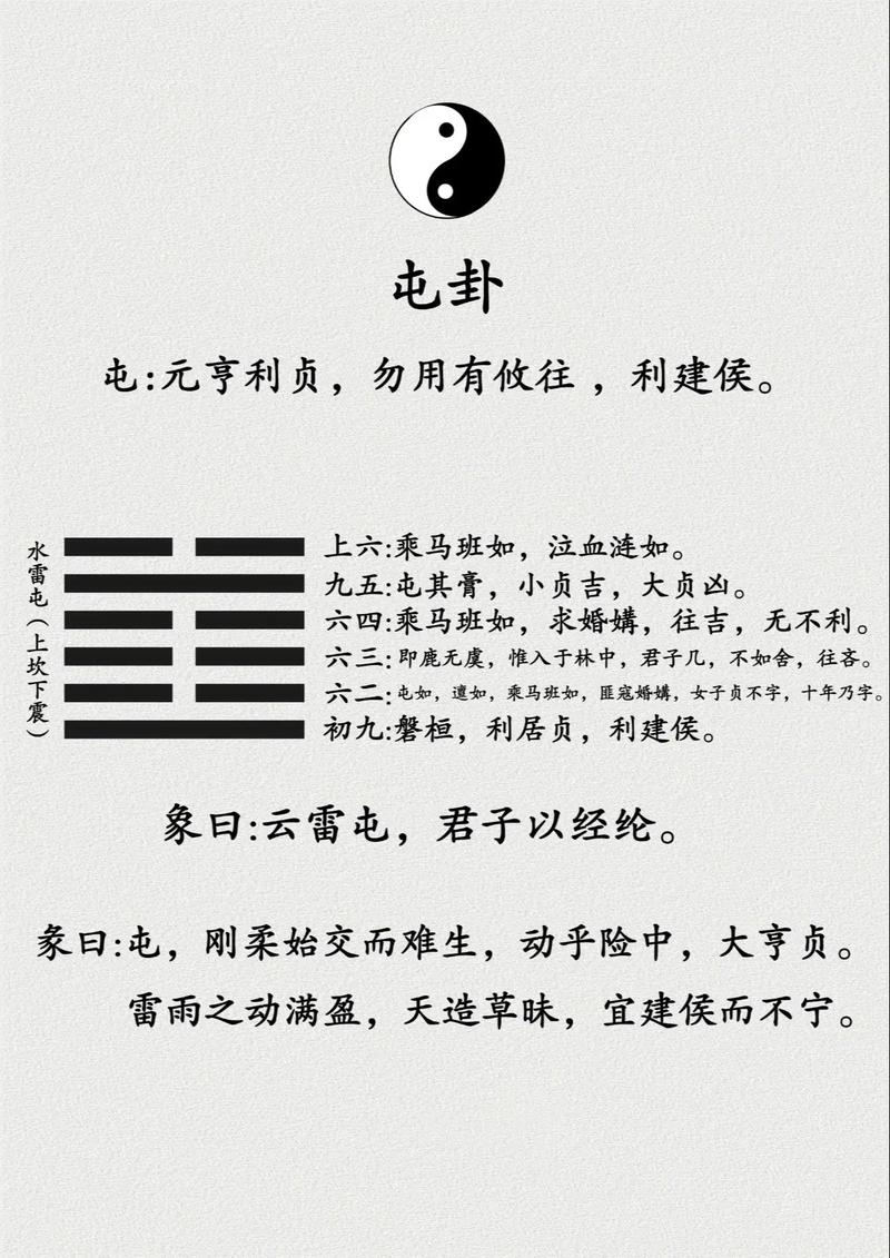 屯卦的六个爻位,代表了事情发展的不同阶段、每一爻的变动,都会对吉凶成度产生决定性的修整。