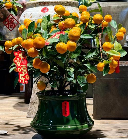 空隙处点缀九颗金黄色的砂糖橘(九九归一,大吉大利)。