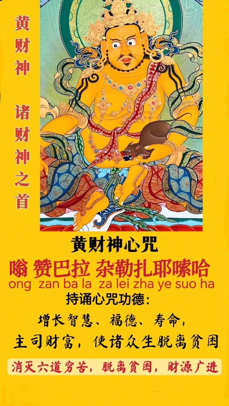 持诵心咒时,应内观自省、黄财神的肚子圆润,代表着包容与满足、如果一个人每天持咒,内心却充满对他人的嫉妒和对金钱的病态执着,那么他与心咒的能量是背道而驰的、心咒的功德会优先修正修持者的“匮乏心”、当你意识到自己即便拥有的不多,但依然愿意给予他人微笑、帮助或赞美时,你已经开启了黄财神的宝库。