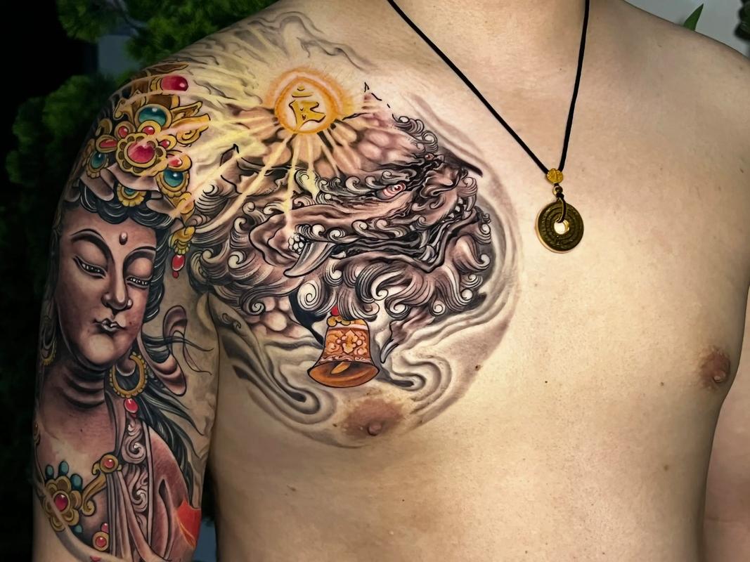 胸前代表内心、只有意志力极强、问心无愧之人方可纹在胸前、这象征着佛在心中,时刻自省、但从避讳角度讲,胸前纹佛像对日常生活的礼仪要求极高,若无法做到长期克己复礼,不建议选此位置。