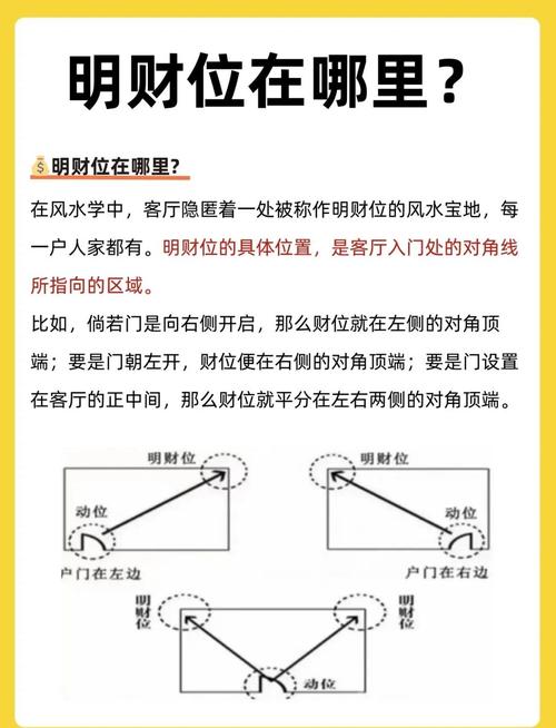 本宅财位:需根据新房的坐向来定、通常大门的斜对角为“明财位”。