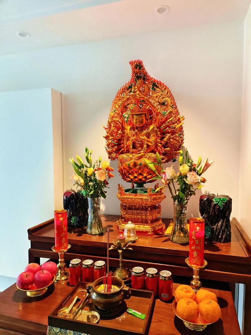 摆放位置要有主次之分、观音菩萨居中,贡品分布两侧,不能遮挡住菩萨的视线(即法相的眼睛)、香炉的高度也不宜过高,不能高过菩萨的胸部,否则会有“反客为主”的嫌疑,在风水上这会导致小辈忤逆或下属不服管教。