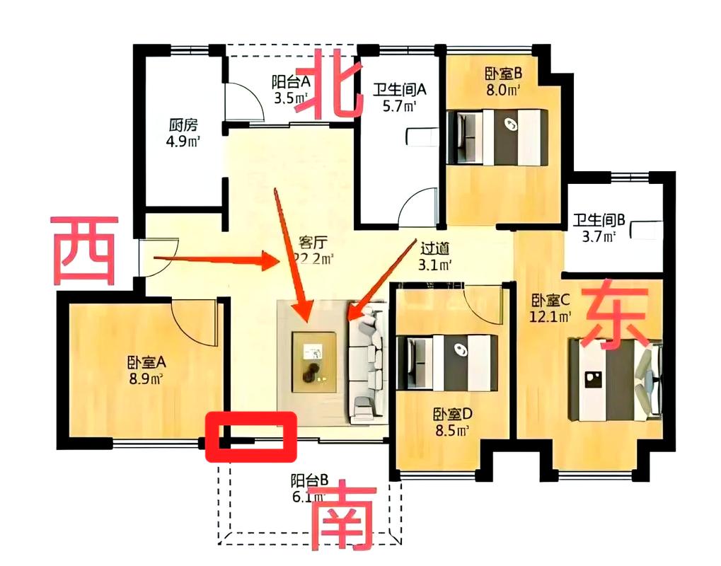 明财位是入户门的对角线位置、如果门开在左边,财位就在右边对角线;如果门开在右边,财位就在左边对角线;如果门开在中间,左右两个对角线都可以作为参考,但要选光线更充足、更稳固的一侧。