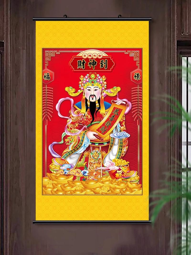 财神挂画的高度有严格要求、通常以画中财神的眼睛与成年人站立时的视线持平或稍高为宜、这代表着“仰望财神”,表达了敬意、若挂得过低,是对神祇的不敬,难以起到招财之效;挂得过高,则会导致财气飘浮,难以落地。