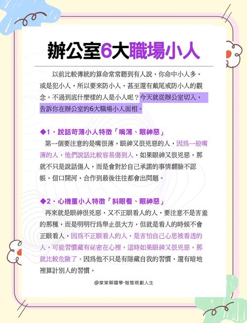 面相是内心的外化,但并非绝对的命运枷锁、在职场中,不仅要看一个人的面相,更要考察其言行的一致性、真正的“小人”往往能伪装,但面部细微的肌肉反应很难完全欺骗观察者、保持敏锐的洞察力,修炼自己的气场,让那些试图通过损人利己的阴暗行为无法对你产生干扰、无论外界环境如何变动,稳住心态,守住底线,便是最好的风水。