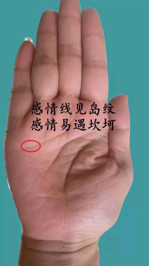 感情线末端(食指下方)出现的岛纹,则更多地表现为对爱人的过度掌控欲或不切实际的期望、这类人往往在感情中投入极深,但也最容易受伤、若岛纹出现在感情线的分叉处,则预示着容易陷入多角纠纷,感情生活复杂且难以理清,甚至可能因为情色纠纷而损毁名誉。