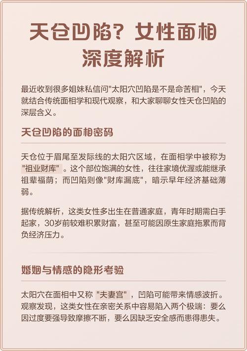 2. 凹陷且色泽暗淡:这在相学中被称为“滞气”、如果天仓位置肤色发黑、发青或枯黄,说明近期有重大的破财风险或身体处于亚健康状态、这通常是因为操劳过度,肾气亏损所致。