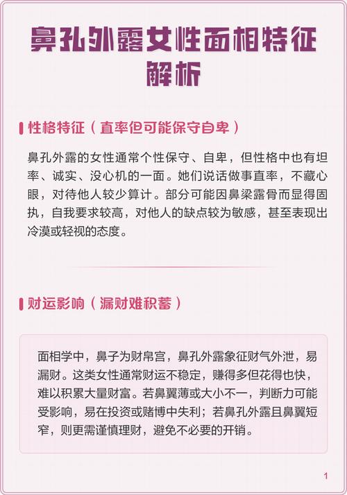 在面相学传统语境中,鼻子被视为“财帛宫”,不仅关乎财富的积蓄能力,更象征着一个人的自我意识、责任感与守财准则、民间常言“鼻翼有肉,财库丰盈”,而“鼻孔外露”作为一种特殊的生理特征,在相书典籍中往往被赋予了明确的指向性解读。