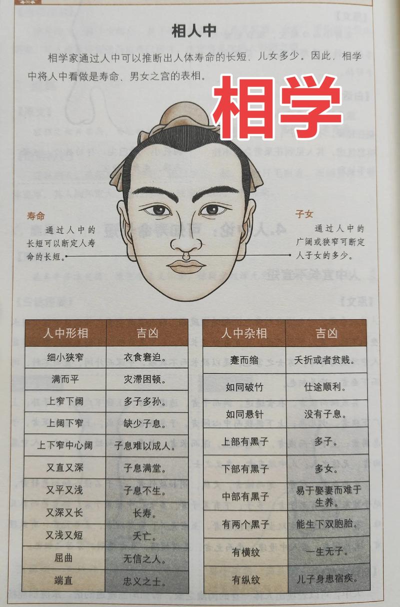 3. 人中避忌:若是人中平满、甚至有横纹、恶痣,则代表子女缘分较薄,或者在抚育过程中容易产生难以调和的矛盾、这种面相者,往往子女不在身边,或者亲子间容易产生代沟。