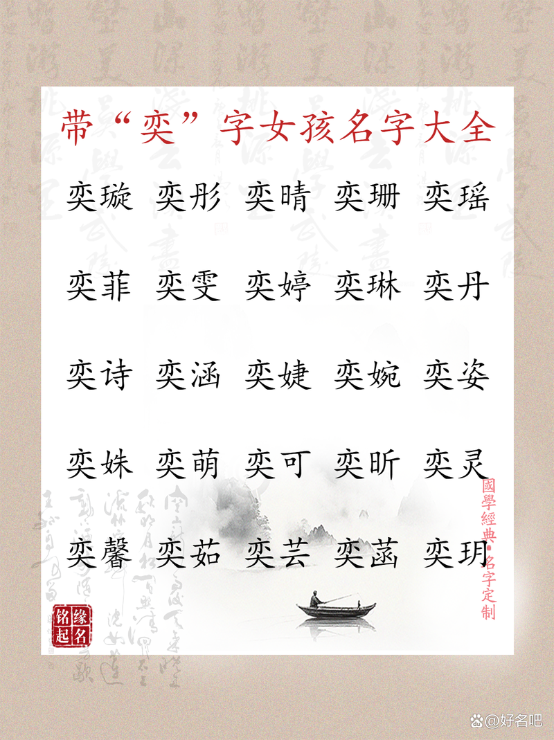 奕静、奕君、奕宁、奕淑、奕如、奕珍、奕雅、奕娴、奕慧、奕敏、奕芸、奕菡、奕芳、奕蓉、奕梦、奕琳、奕瑶、奕瑾、奕璇、奕璠。