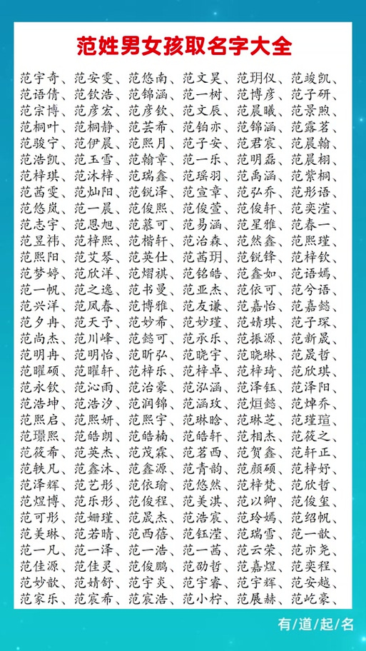 字形上,由于范姓是上下结构且带有草字头,名字的后两个字建议在结构上有所变化、如果后两个字也是上下结构,整体会显得过于压抑;如果选择左右结构或独体字的汉字,则能打破视觉上的单调感,让整个名字看起来错落有致。
