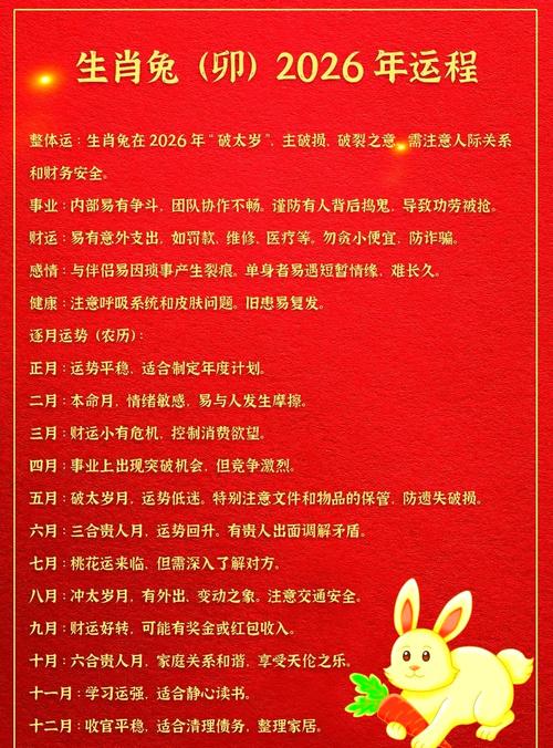 岁次丙午,火马奔腾之年、于卯兔而言,此年景颇有周折、卯为木,午为火,木生火,看似相生,实则自身元气耗泄、更兼卯午相破,是为“破太岁”,人际关系、合作事宜暗藏裂痕,财源根基易受动摇、故此,2026年属兔人欲求财运亨通,不可不察方位之玄机,趋吉避凶,方能于波澜中稳坐钓鱼船。