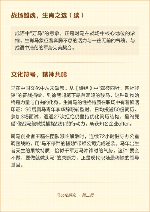 对于属相为马的人来说,二零二六年的本命年虽然压力大,但也意味着掌握权柄、如果你能克服自刑带来的负面情绪,学会利用团队的力量(千军万马),而非单打独斗,这一年完全可以成为你人生转折的丰碑、关键在于一个“稳”字、马的四蹄只要有一蹄不稳,就有摔倒的危险、每走一步都要看清脚下的路。